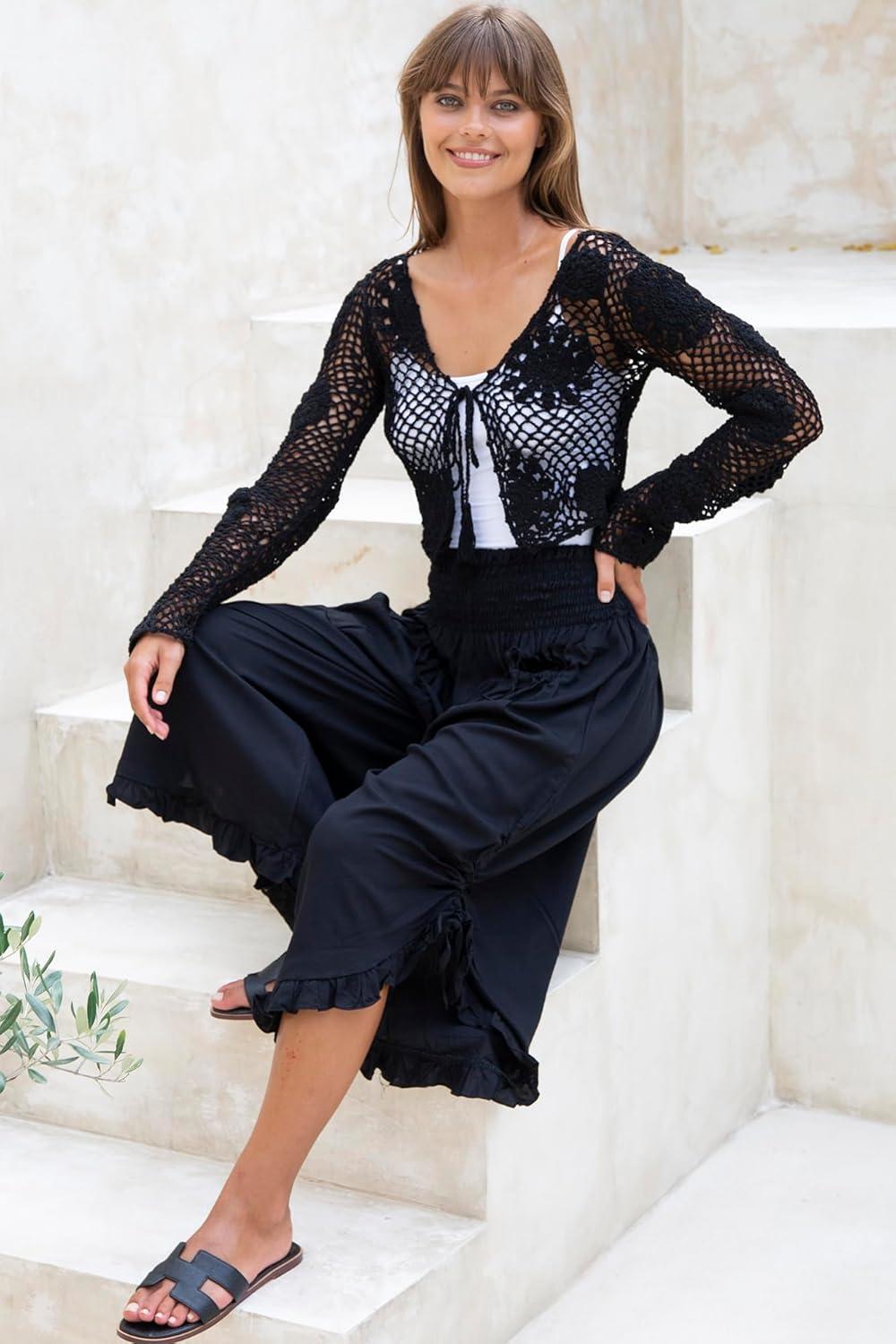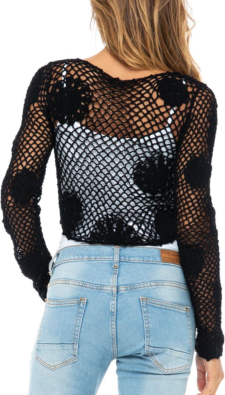 Back From Bali Womens 100% Cotton Crochet Tie-Front Artisan Shrug Sweater Cropped Lightweight Flower Knit Bolero(Black)