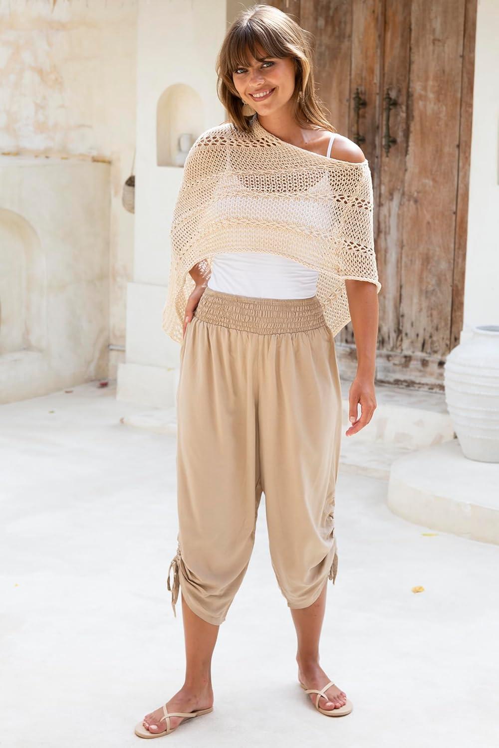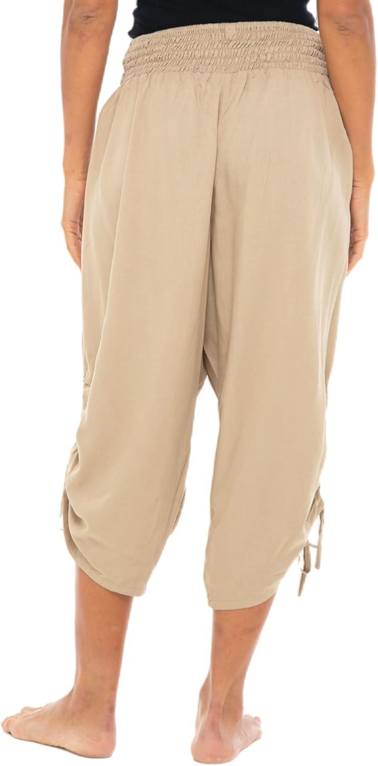 Back From Bali Womens Boho Wide Leg Loose Pants Cropped Rayon Summer Beach Pants Smocked Waist (S-4XL)(Beige)