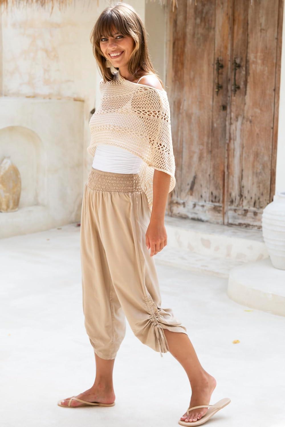 imageBack From Bali Womens Boho Wide Leg Loose Pants Cropped Rayon Summer Beach Pants Smocked Waist S4XLBeige