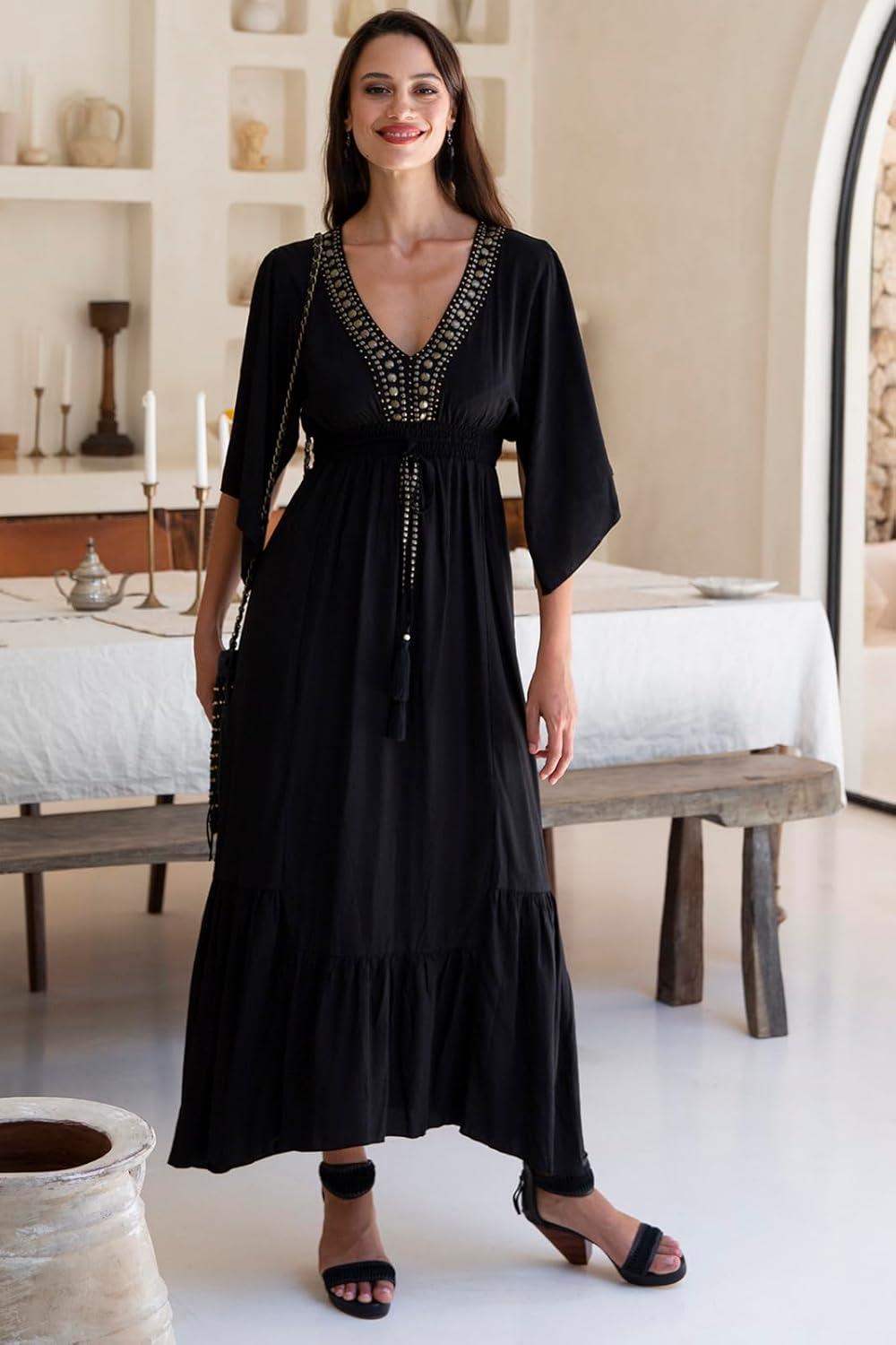 Back From Bali Womens Casual Boho Dress Long Maxi Flowy Dresses with Deep V Neck Summer Sundress(Black)
