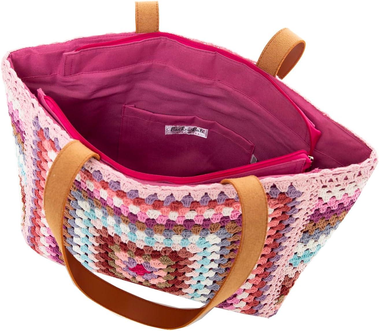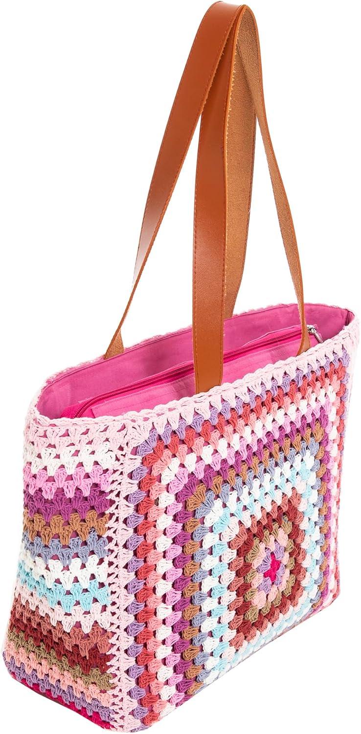 Back From Bali Womens Large Hand Crochet Tote Bag – Fully Lined, Zipper Closure Over the Shoulder Handle Handbag(Pink)