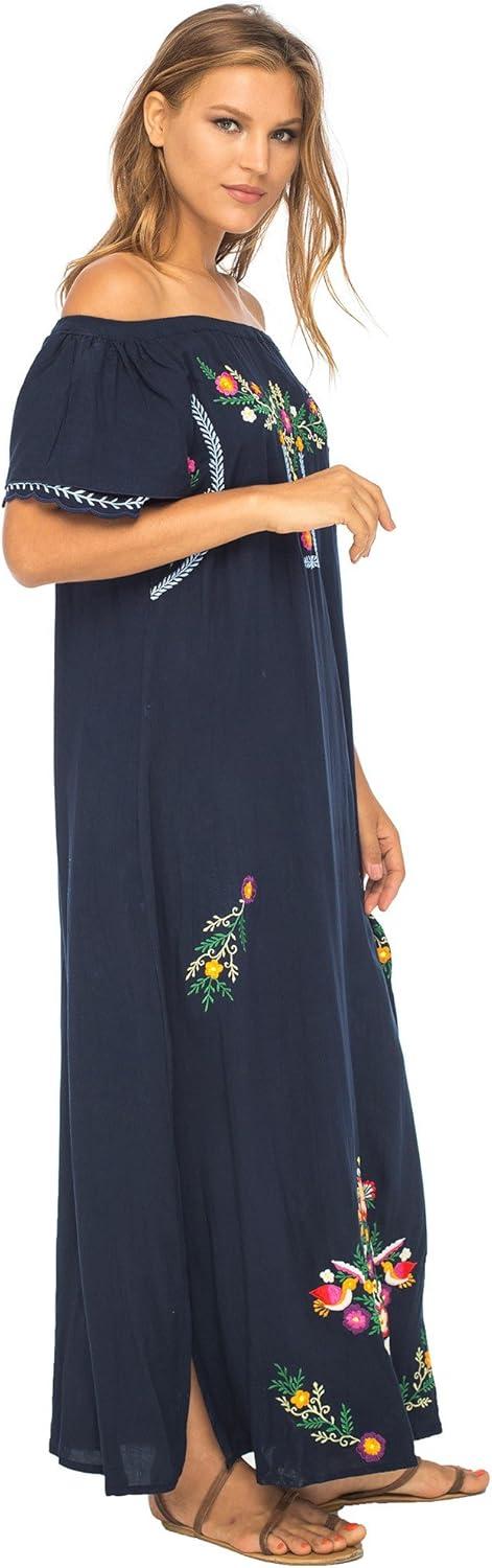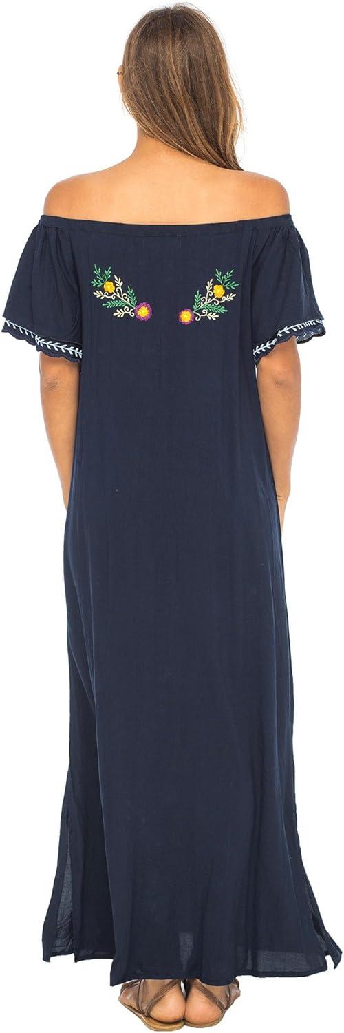 Back From Bali Womens Long Mexican Embroidered Dress, Maxi Long Summer Peasant Dresses for Women Off The Shoulder(Navy)