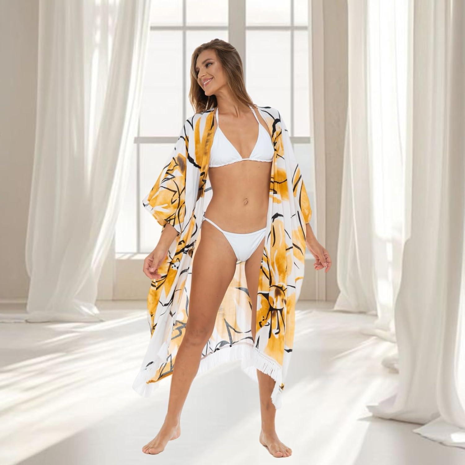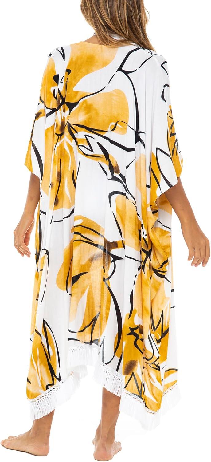 Back From Bali Womens Long Open Front Kimono Cardigan Boho Flowy Swimsuit Cover Up Summer Rayon Beach Duster(Yellow Blossom)