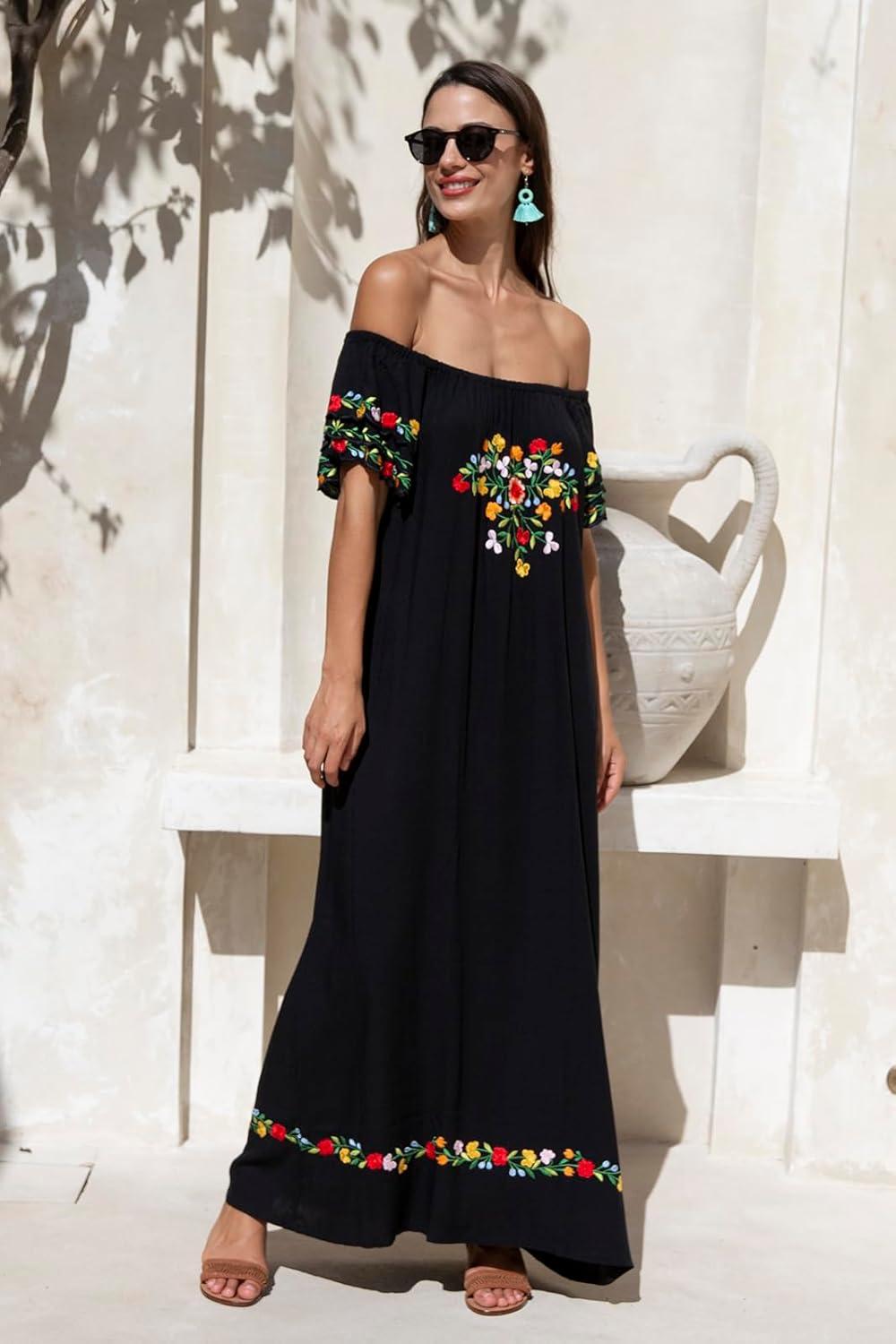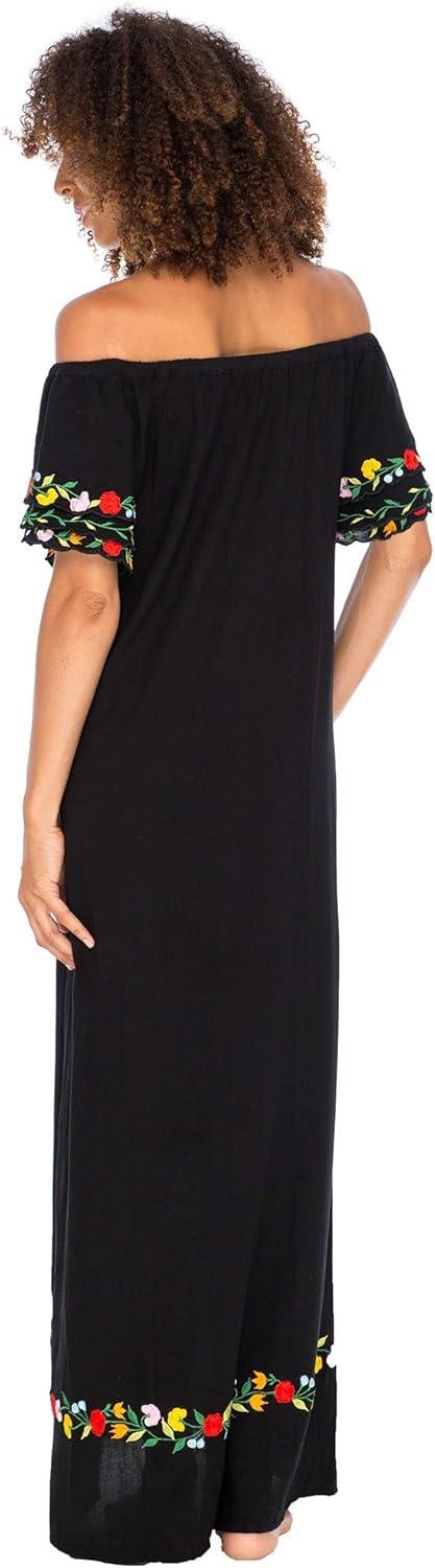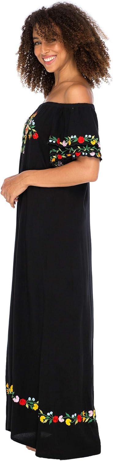 Back From Bali Womens Off Shoulder Long Mexican Embroidered Dress Maxi Boho Floral Summer Peasant Dress(Black)