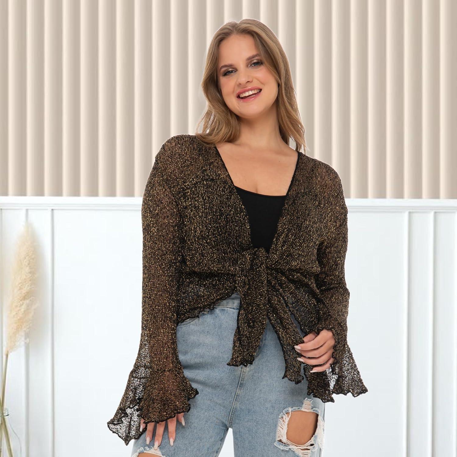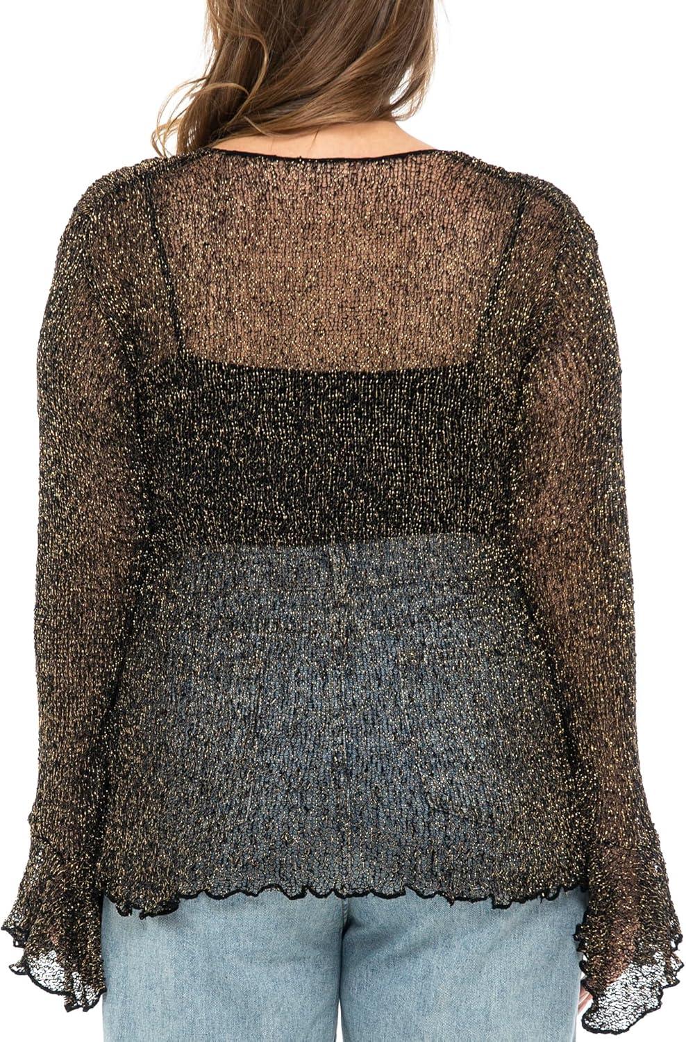 Back From Bali Womens Plus Size Sheer Shrug Cardigan Long Bell Sleeves Lightweight Knit Bolero 2X 3X 4X(Black Gold)
