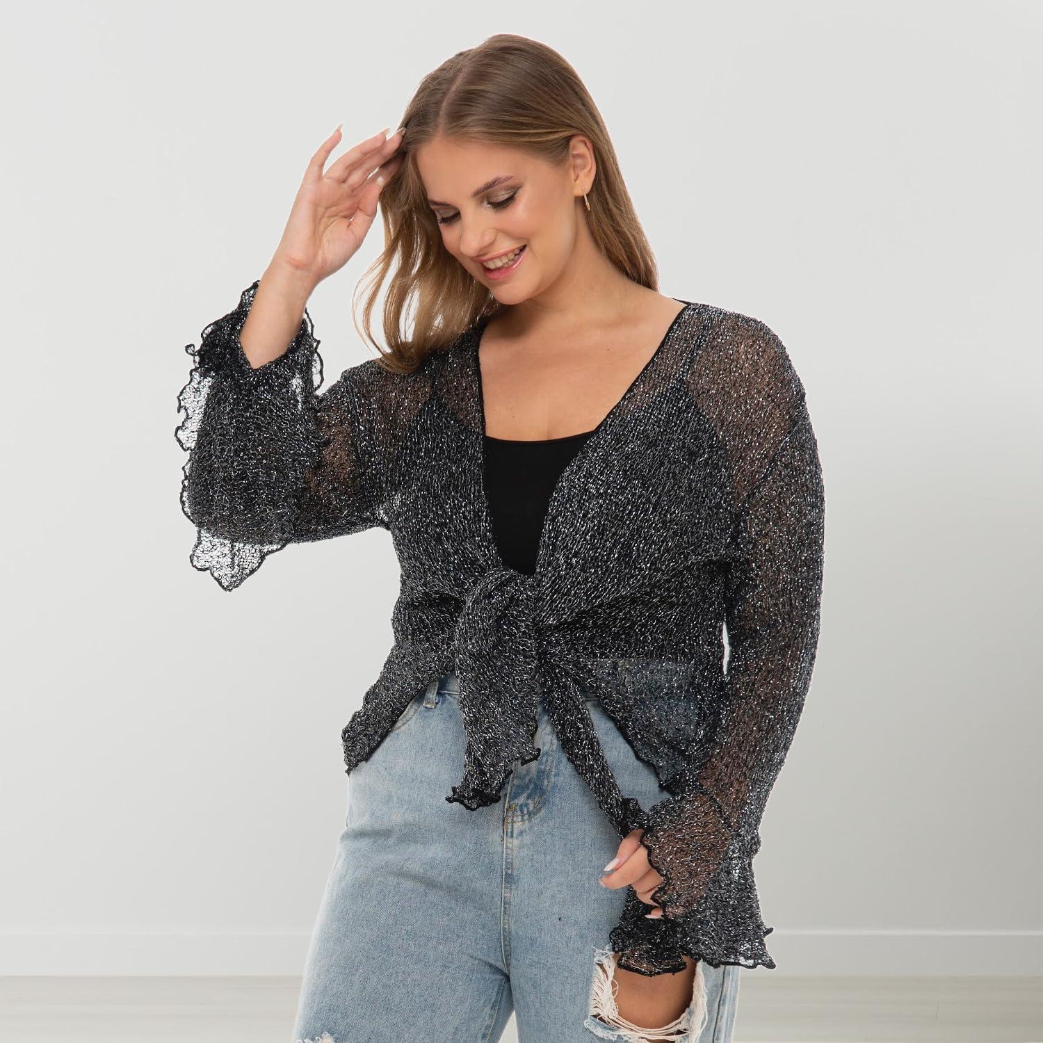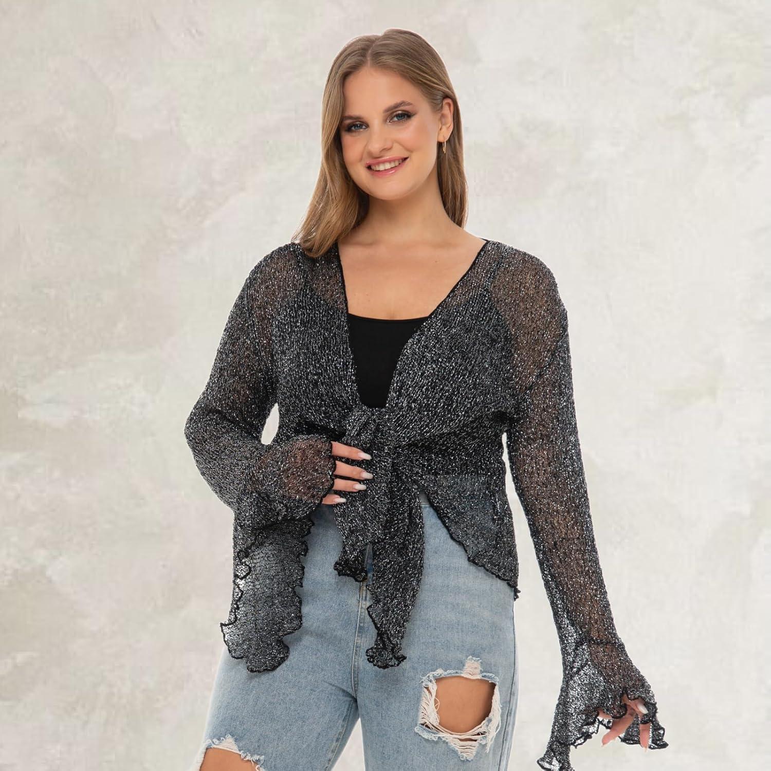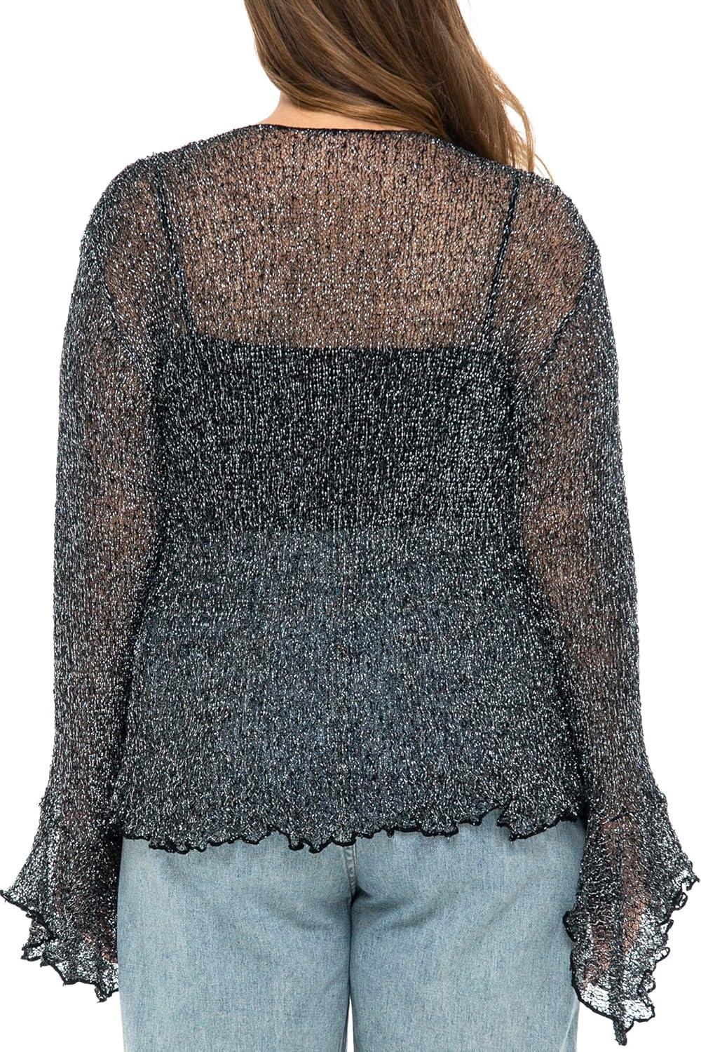 Back From Bali Womens Plus Size Sheer Shrug Cardigan Long Bell Sleeves Lightweight Knit Bolero 2X 3X 4X(Black Silver)