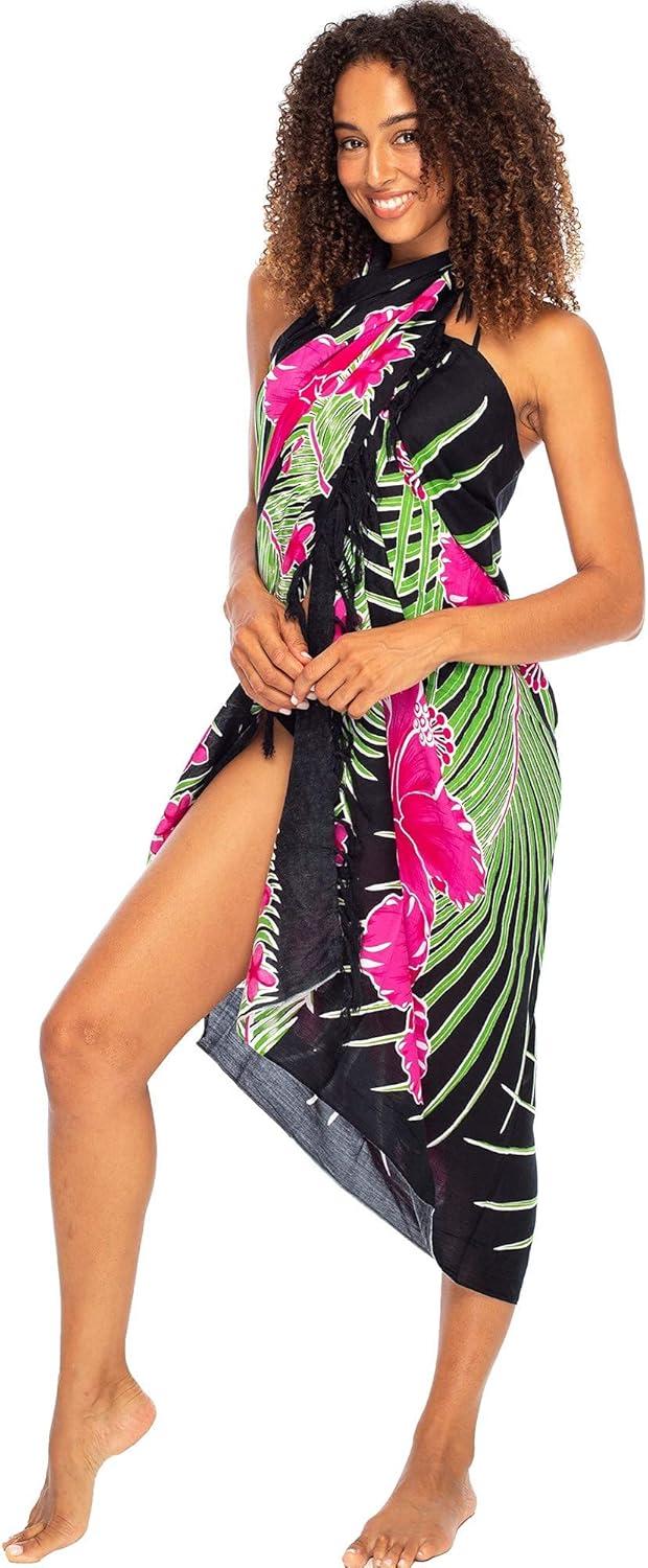 Back From Bali Womens Print Sarong Swimsuit Beach Cover Up Wrap Skirt Pareo(Hibiscus Black Pink)