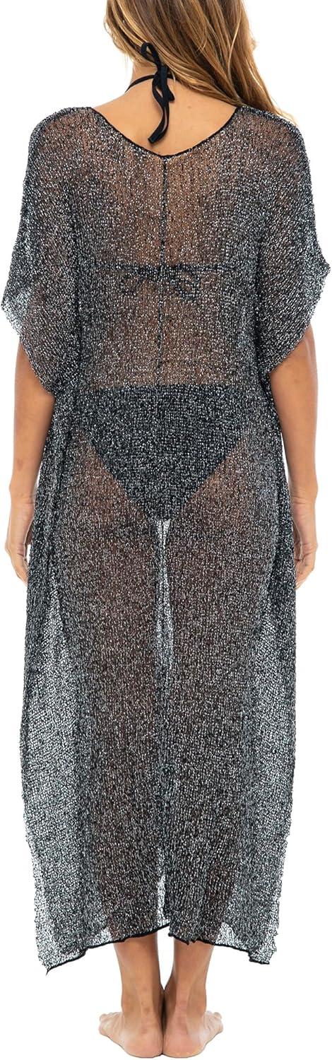 Back From Bali Womens Sheer Long Swimsuit Cover Up Sexy Pullover Metallic Mesh Knit Beach Poncho(Black Silver)