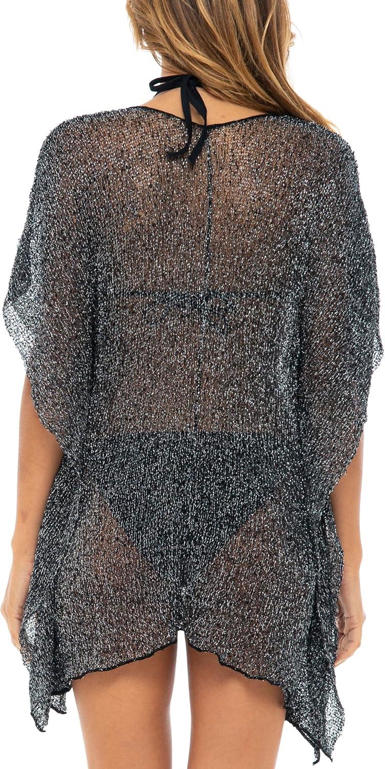 Back From Bali Womens Sheer Short Swimsuit Cover Up Sexy Pullover Metallic Mesh Knit Beach Poncho(Black Silver)