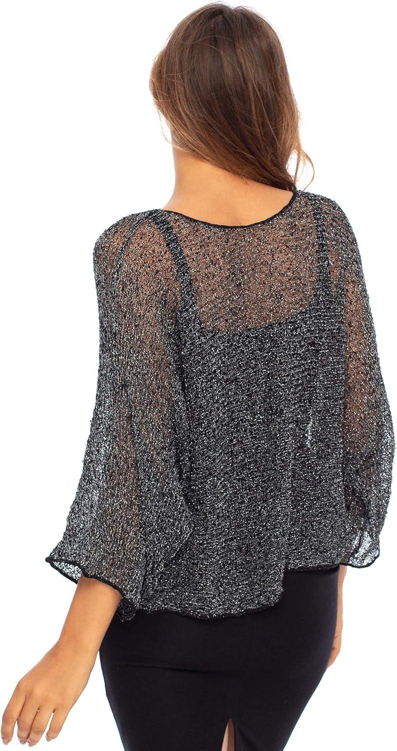Back From Bali Womens Sheer Shrug Dressy Poncho Top Lightweight Mesh Knit Sweater Dolman Sleeves(Black Silver)