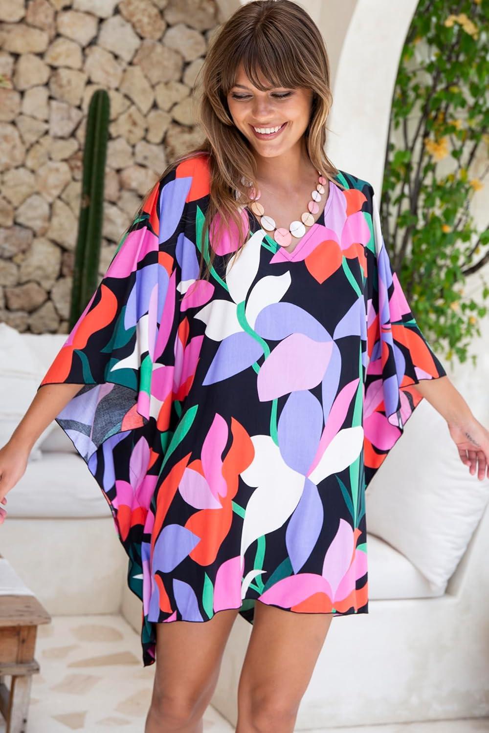 Back From Bali Womens Short Beach Swimsuit Cover Up Caftan Pullover Floral Poncho for Bathing Suit(Pop Floral Black)