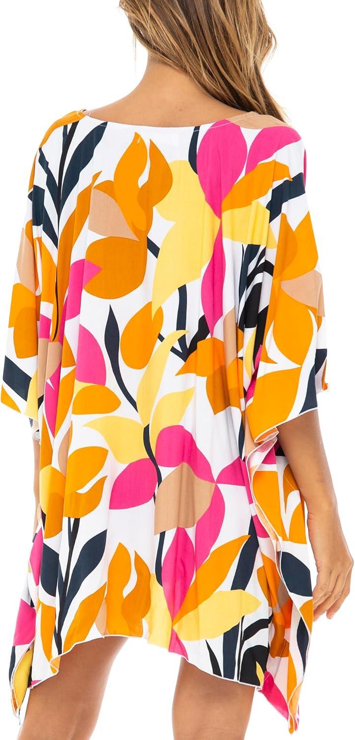 Back From Bali Womens Short Beach Swimsuit Cover Up Caftan Pullover Floral Poncho for Bathing Suit(Pop Floral White)