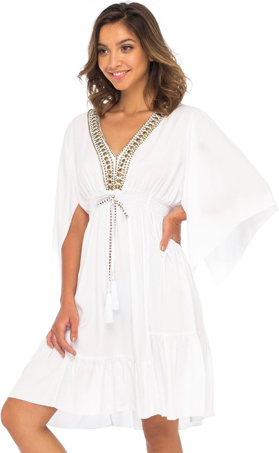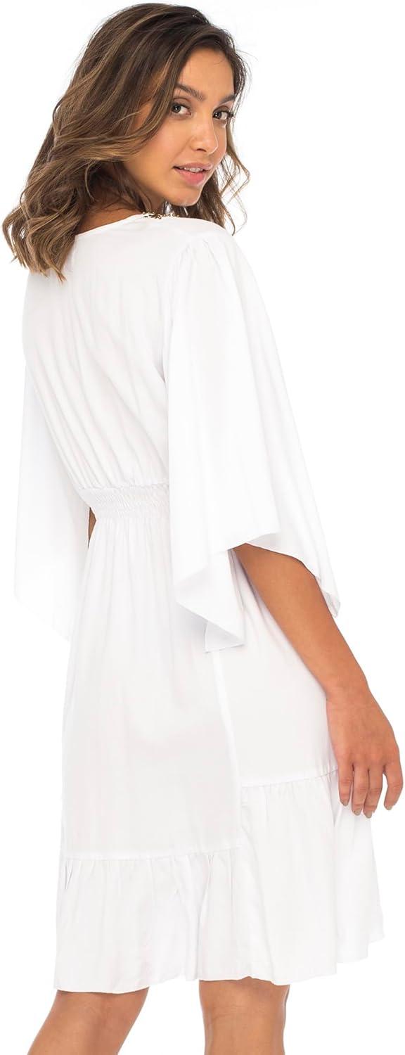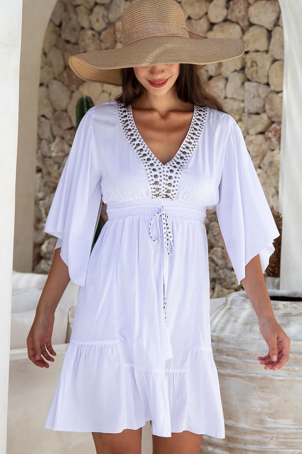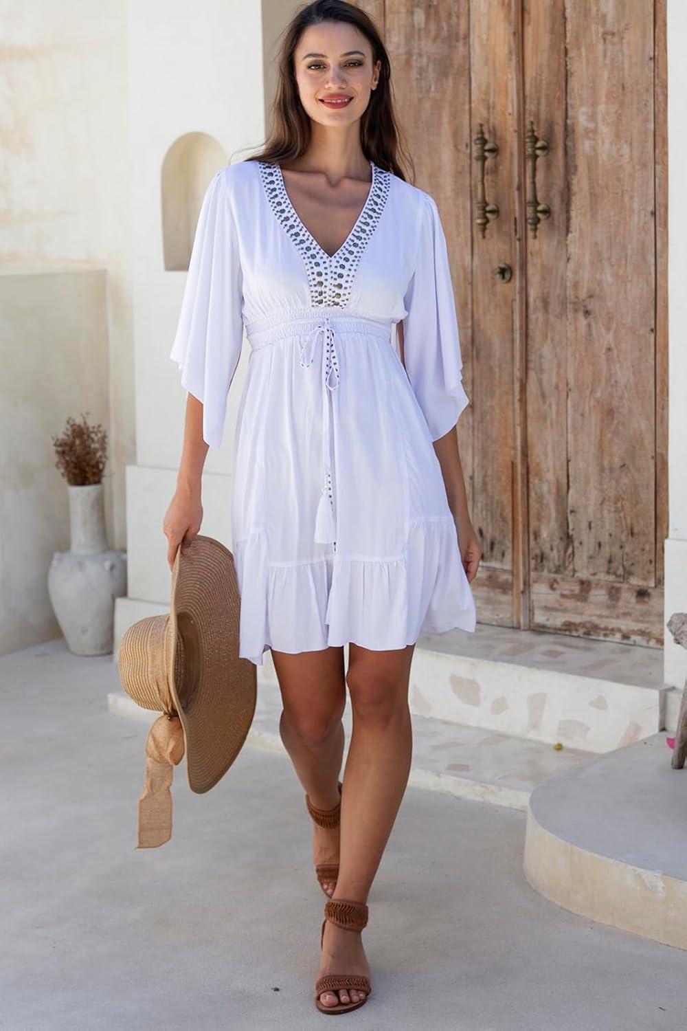 Back From Bali Womens Short Sundress Flowy Boho Beach Dress with Beaded Deep V Neck, Casual Sexy Summer Party Dress(White)