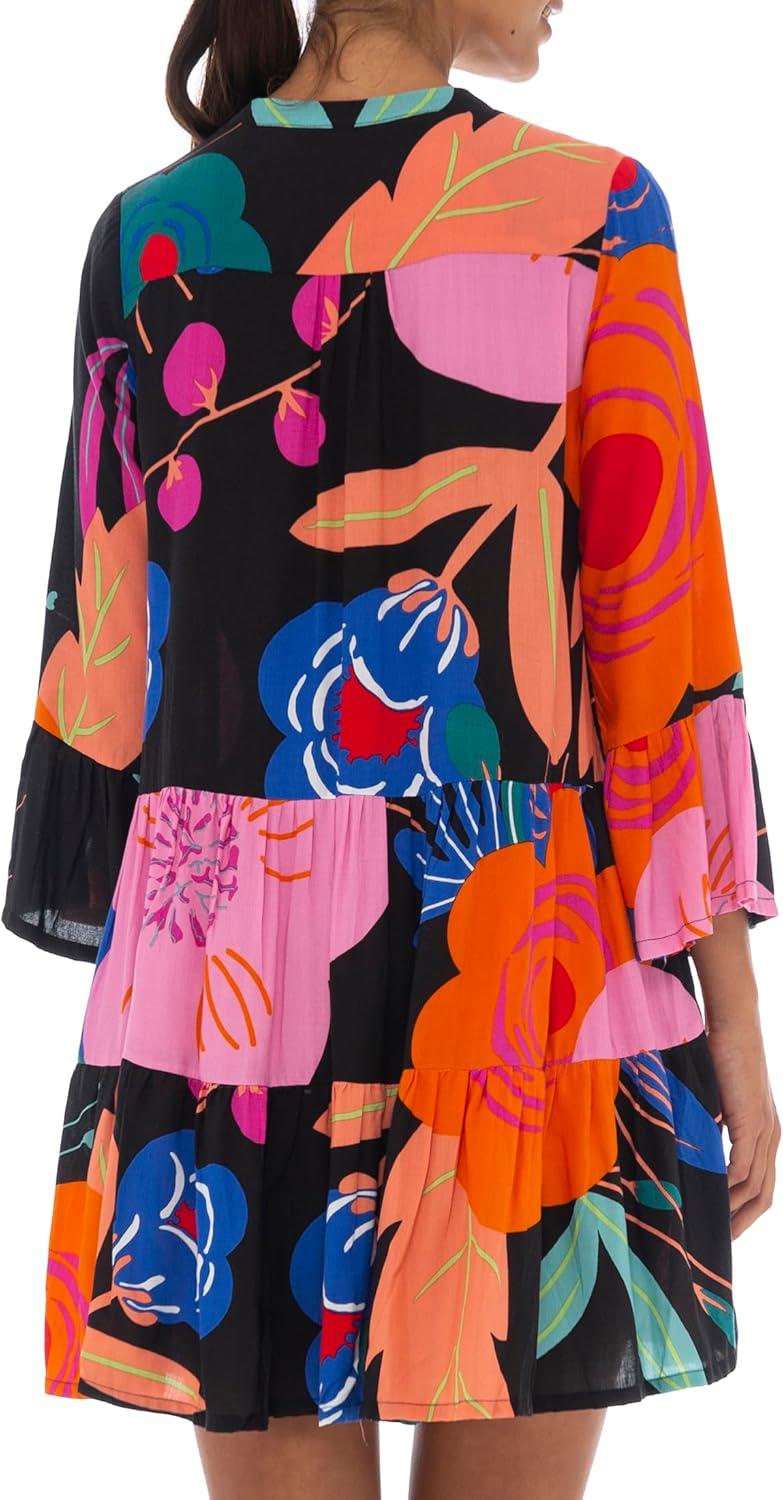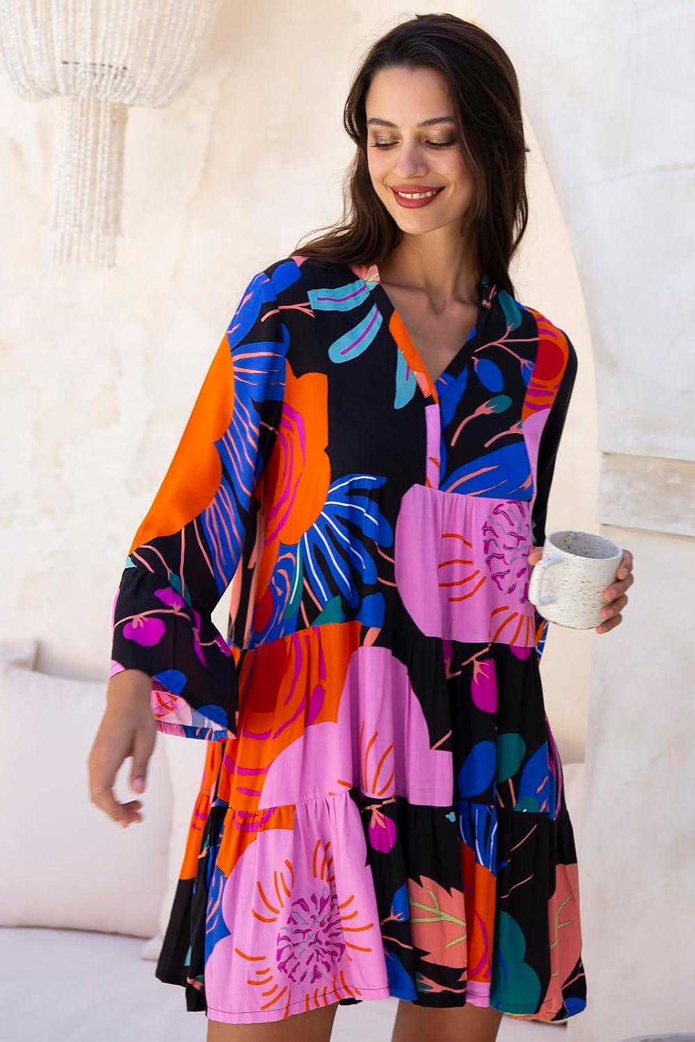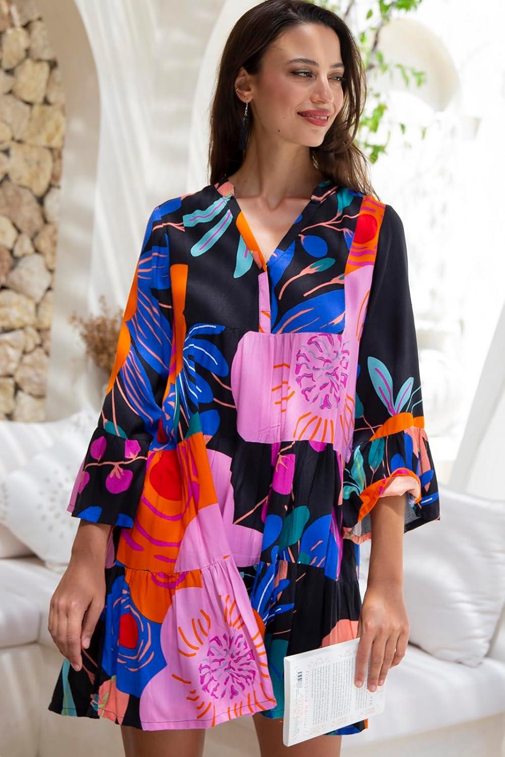 Back From Bali Womens Short Sundress Flowy Boho Beach Dress with Embroidered V Neck, Casual Sexy Summer Party Dress(Flower Black)