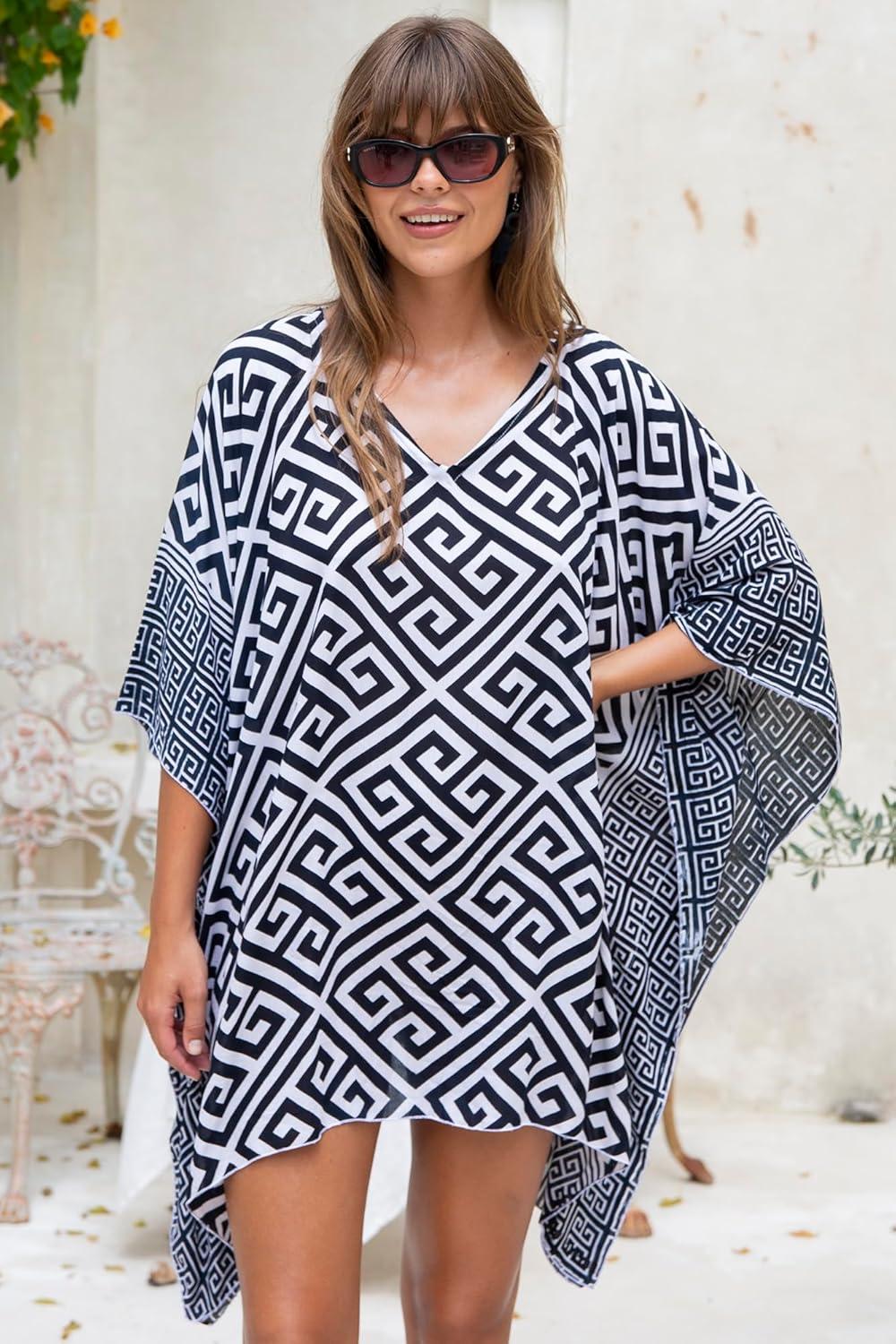 Back From Bali Womens Swimsuit Cover Up Short Poncho Print Pullover Beach Caftan for Bathing Suit(Graphic Black)